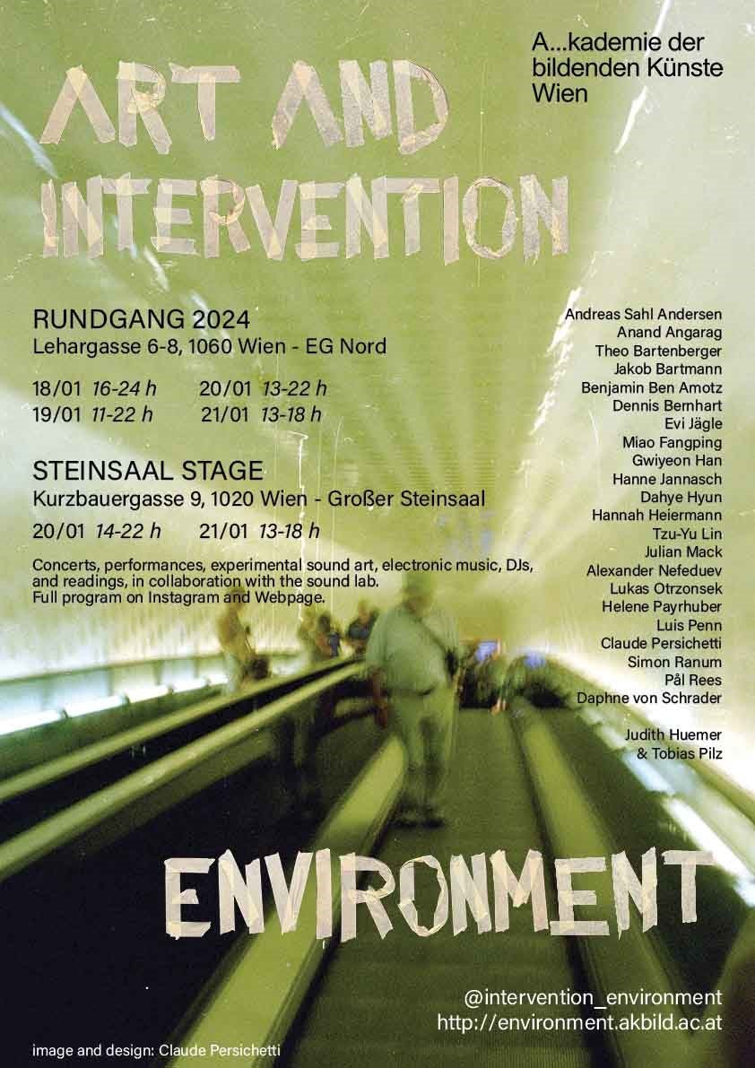 Teilnehmer_innen: Benjamin Ben Amotz, Andreas Sahl Andersen, Anand Angarag, Theo Bartenberger, Jakob Bartmann, Dennis Bernhart, Daphne von Schrader, Evi Jägle, Miao Fangping, Gwiyeon Han, Hanne Jannasch, Hyun Dahye, Hannah Heiermann, Julian Mack, Alexander Nefeduev, Lukas Otrzonsek, Helene Payrhuber, Luis Penn, Claude Persichetti, Simon Ranum, Pål Rees , Lin Tzu-Yu