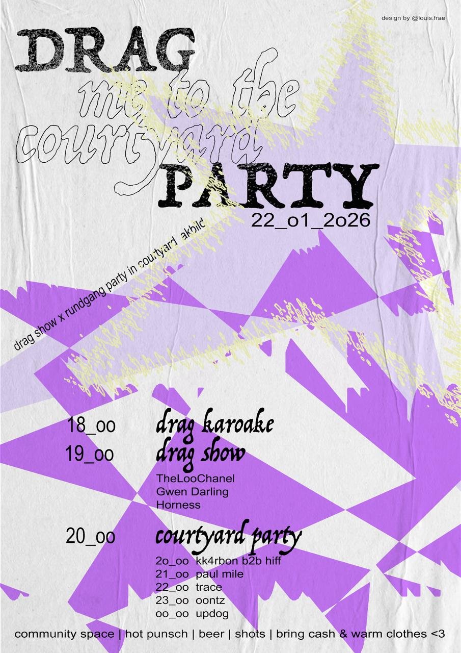 Zum Rundgang öffnen wir einen Möglichkeitsraum, der als Ausgangspunkt für zukünftige Nutzungen dient. Das Programm umfasst Installationen, Performances, kollektive Lese- und Körperpraktiken, Screenings, Workshops, sowie eine Bar mit Tee und Punsch – ein Ort zum Begegnen, Austauschen und Zusammensein – Common Ground.
