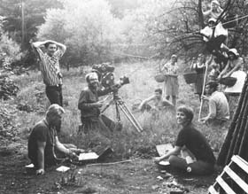 © Peter Kodera|Im Garten der Familie Bauer. Fery Radax, Tonmeister Blum, Peter Kodera, im Hintergrund Wolfgang Bauer, Ida Radax, Tonangler Sandhöfler und Apfelpflückende.
