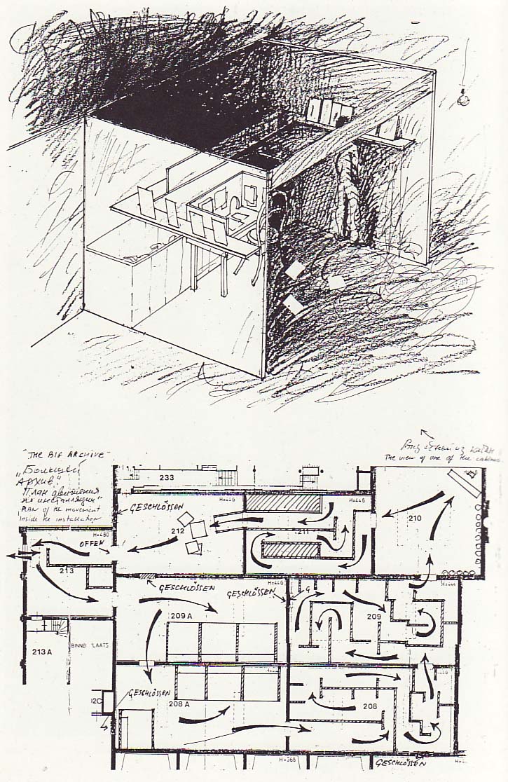 Das in der KUNSTHALLE Wien ab 8. Oktober bis 7. Februar gezeigte und rund 160 m 2 große Kunstwerk Das große Archiv gehört zu einer Gruppe von Installationen, die unter dem Titel Die russische Welt zusammengefasst sind. Ein System von mehreren klaustrophobisch anmutenden und labyrinthisch angelegten, spärlich mit nackten Glühbirnen beleuchteten Räumen und einer minutiösen Anordnung von rund 800 Zeichnungen, Schrift- und Möbelstücken bildet für sich alleine die Grundlage des Großen Archivs . An den Wänden hängen handgeschriebene Aufrufe, die zum Ausfüllen und zur Abgabe stumpfsinniger Formulare und Fragebögen oder zum Unterschreiben eines Schriftstücks auffordern. Nach der (mental) geleisteten Schreibaufgabe wird es nötig, mit dem Schriftstück zu einem anderen Tisch zu gehen, von dem man aufgrund der kryptischen Anweisung allerdings nicht weiß, wo er sein soll. Auf den Tischen liegt "eine enorme Anzahl von Papieren, […] alle möglichen Papiere, in denen die Person, die zufällig hier herein gerät, leicht ertrinken könnte", wie die Kabakovs verlauten. Beim Betreten sehen sich die Betrachterinnen und Betrachter hier also atmosphärisch in die fantastische Anordnung von Warteschlangen eines kafkaesken Verwaltungsapparates versetzt, wo die Macht der Bürokratie ad absurdum geführt wird. Gleichzeitig handelt es sich nicht um ein rein kontemplatives Erlebnis, sondern jeder einzelne wird auf die Probe gestellt oder auf Erinnerungen an bürokratische Hilfeleistungen zurückgeworfen, wo unter prekären Umständen der schikanierende Formularkrieg zeitlich zum Teil absurde Ausmaße annehmen kann.
