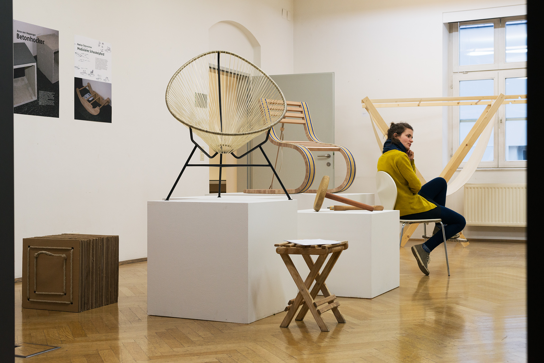 Studierende zeigen Dokumentationsmaterial zur Umgestaltung des IKL Hofs und Möbel-Objekte, die dafür entwickelt wurden.