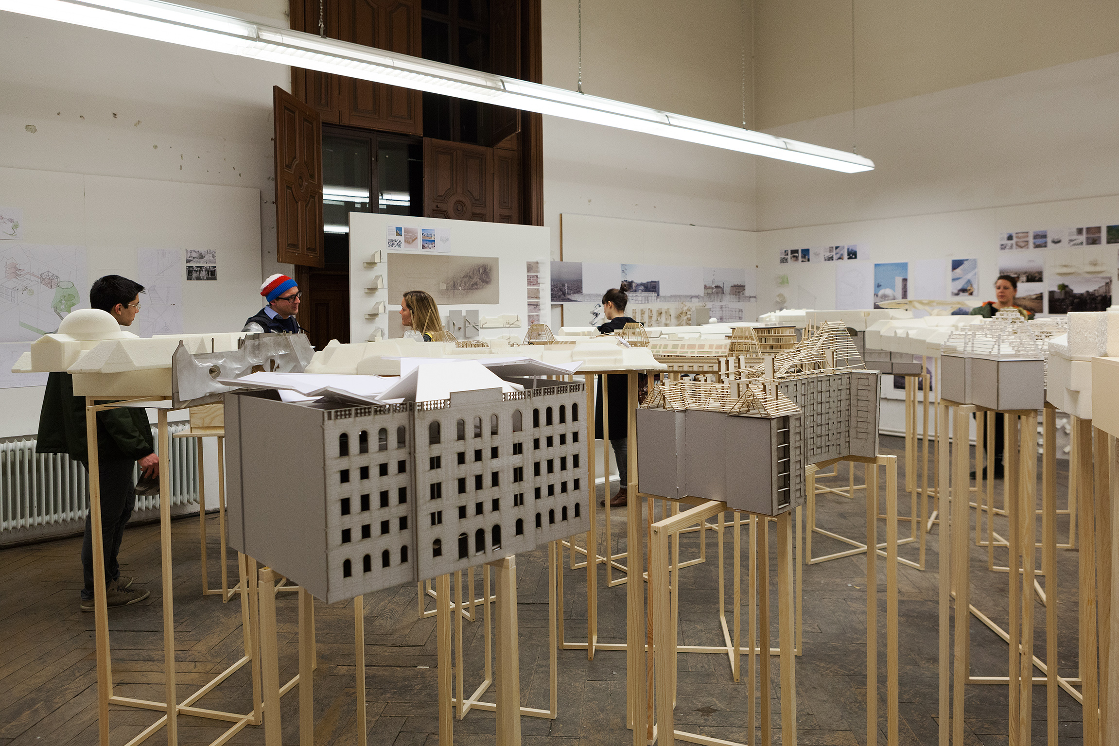 Studierende zeigen Pläne, Karten und Diagramme zu einer Auseinandersetzung mit der Wiener Rahlgasse.