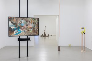 Im Prospekthof des Atelierhauses der Akademie inszeniert Alexander Kluge eine Ausstellung, die der Idee einer Theateraufführung folgend Videostationen als Akteurinnen einsetzt und einen transhistorischen Bühnenraum für multiperspektivische Denkbewegungen offeriert, in deren Mitte das Werk Sphinx Opera von Katharina Grosse steht.