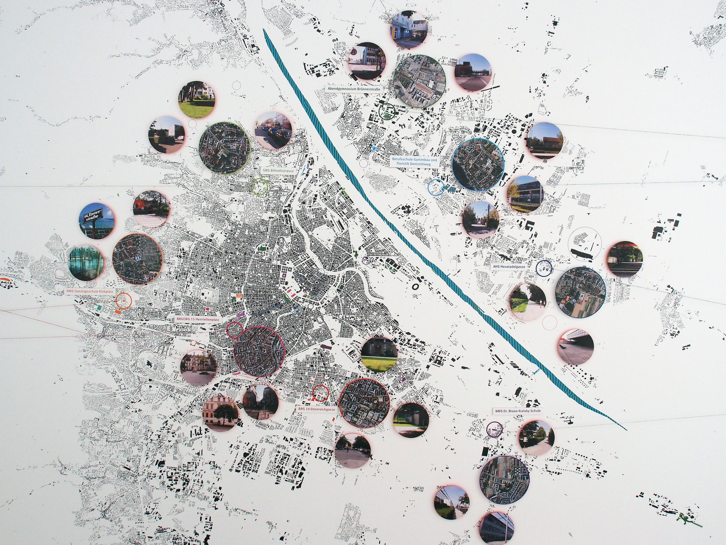 Data was collected via a survey sent to students in eight schools aged 13-19 who attend school in the outer districts of Vienna (see diagram). The questions, which were developed cooperatively in the seminar, aimed to understand the students’ subjective perception of the city. A particular emphasis was given to images of the city and the perceived importance of centers and sub-centers. In addition, students created ‘cognitive maps’-- drawings of their paths to school on which they marked locations that held personal significant for them.