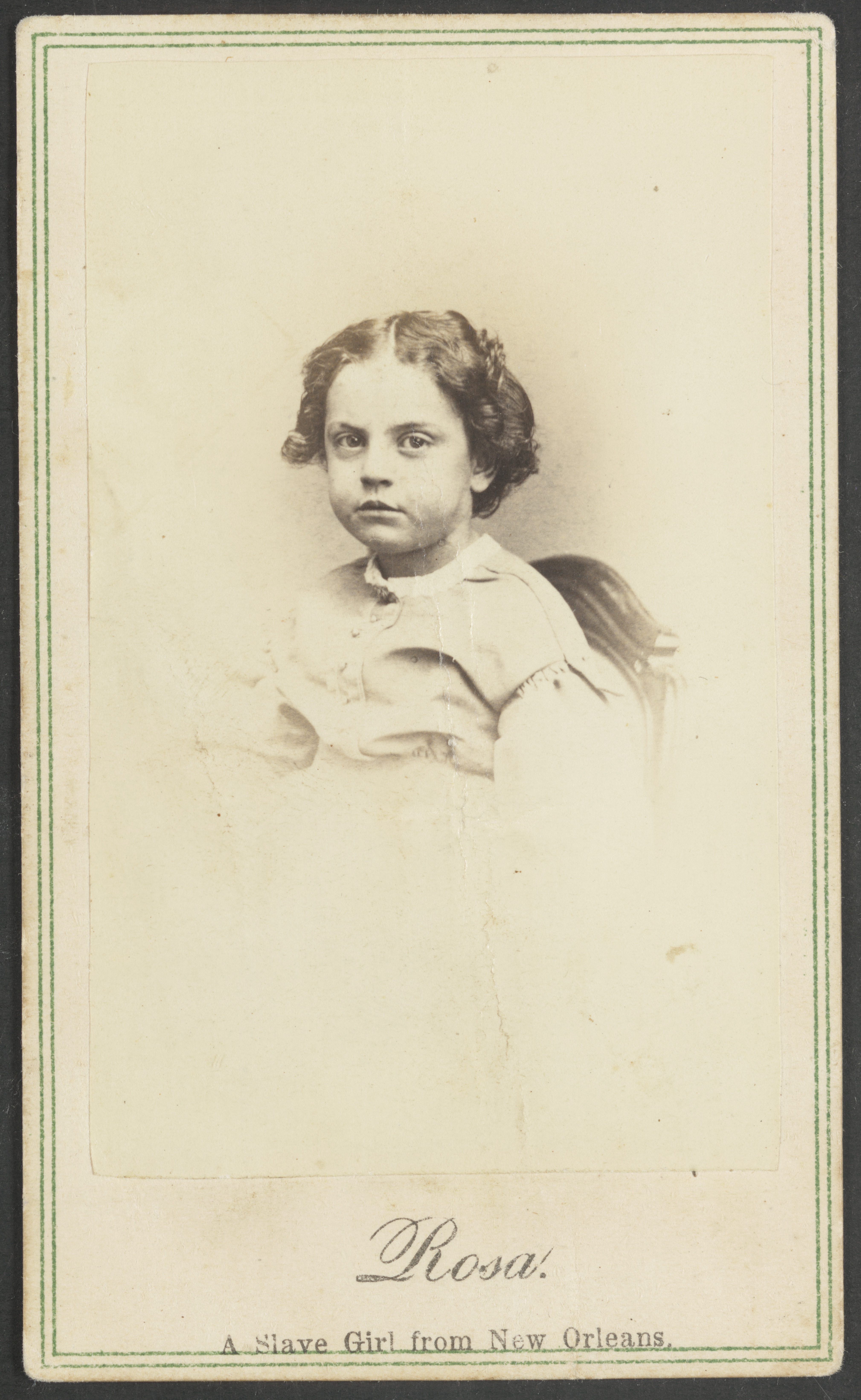Charles Paxon, Rosa, a Slave Girl from New Orleans, albumen print, c. 1864, Library of Congress, Washington D.C. An old studio portrait picture of a young girl. The caption reads "Rosa. A slave girl from New Orleans". Charles Paxon, Rosa, a Slave Girl from New Orleans, c.1864.jpg image/jpeg Type image/jpeg Dimension Dimension 4037x6566 Size File size 3.8 MB Download View full-size image