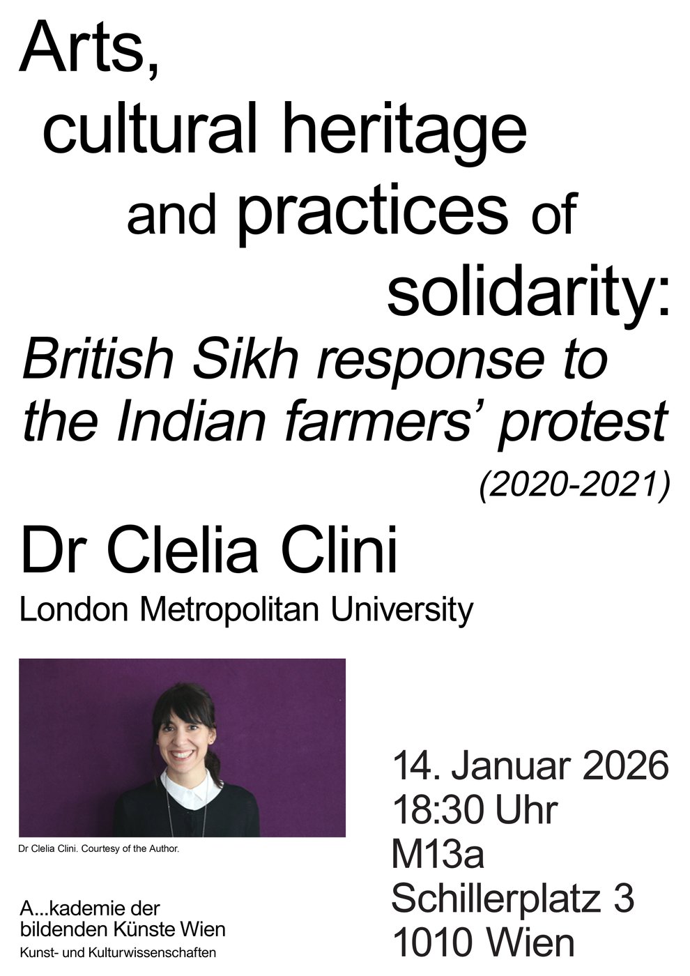 This talk explores the artistic contributions to the Indian farmers protest of 2020-2021 within the British Sikh diaspora, looking specifically at the relationship between arts, activism and politics of identity in the diasporic context . While the protest—one of the largest mobilisations in the history of independent India—drew participation from farmers across several states, Sikh farmers from Punjab and Haryana played a prominent role in movement, sparking a strong response from Sikhs abroad. In the UK, several Sikh groups organised and/or participated in rallies, fundraising initiatives, and creative interventions (for example online music events) in support of Indian farmers. Many artists also contributed to the cause by creating original art pieces, often referencing key Sikh values as well as landmark moments of oppression and resistance in the (post)colonial history of India, and Punjab in particular, which are core elements of narratives of collective memory and identity in the community.