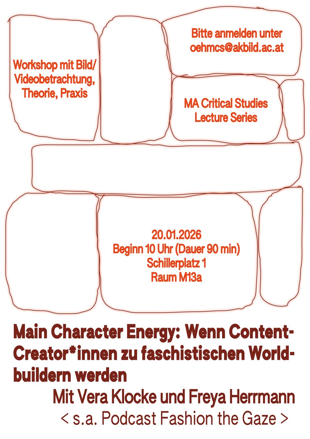 On TikTok and Instagram, millions present themselves as protagonists of coherent worlds – aestheticized and algorithmically optimized. Together with Vera Klocke and Freya Herrmann of the “Fashion the Gaze” podcast, participants of this workshop analyze how main character energy and obsessive curation are embedded in techno-feudal platform economies and what affinities to fascist aesthetics can arise.