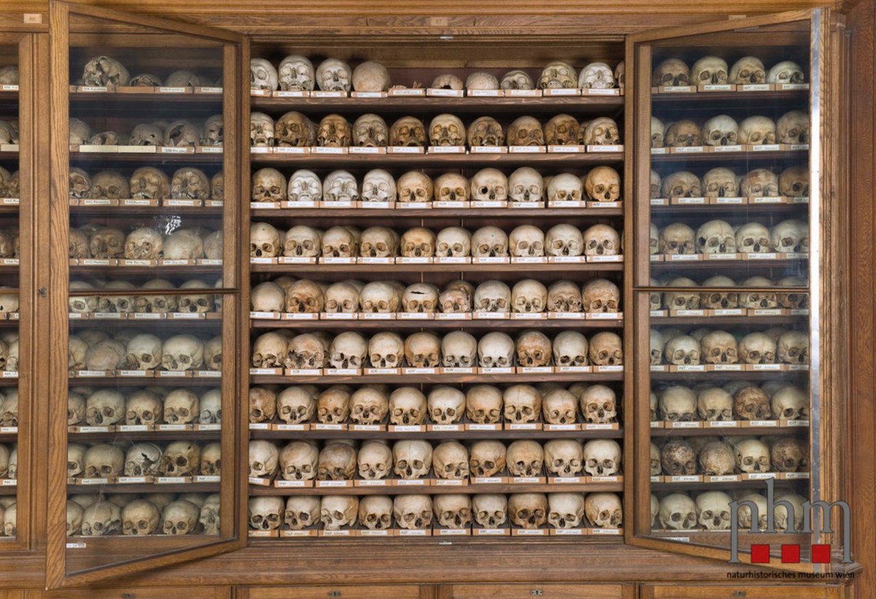 The picture shows an old wooden cabinet with glass doors. Its doors are open, its content is skulls, labelled on the shelf with small cards. The cabinet is part of the skeleton collection at the Natural History Museum Vienna, which is indicated by the logo of the NHM in the lower right corner.