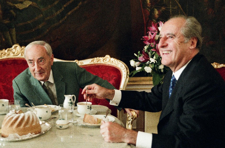 The documentary CITIZEN KRONE (2002) by Belgian filmmaker Nathalie Borgers shows Hans Dichand (Founder and publisher of the Kronen-Newspaper) with the former Austrian president Thomas Klestil in Vienna’s Hofburg while having cake – a Gugelhupf. Thereafter, Klestil eagerly leads Dichand through his offices at the Hofburg. This has been often interpreted as Klestil’s going down on his knees in front of Dichand, and, according to observers, testifies to Dichand’s status of power. In his 1996 book, Dichand himself described his role as being in the “atrium of power” (also the title of his book), but nonchalantly relativized this stance later. This documentary film has never been shown by Austria’s public broadcasting station, a decision officially justified by “journalistic deficits” because in one short instance, Borgers used unauthorized, accidental audio material of this visit to the Hofburg.