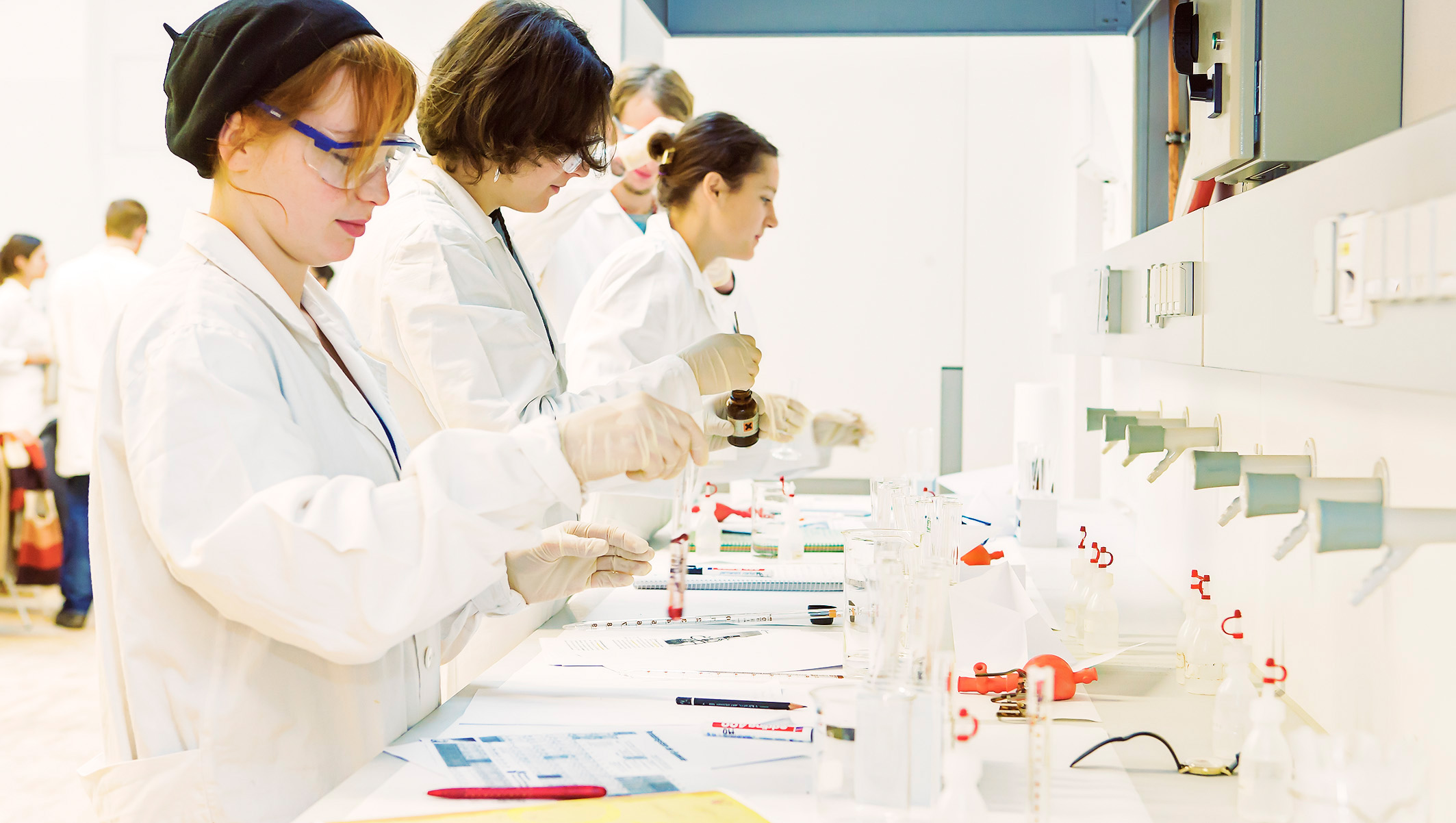 Students during their practical work in the lab of colour chemistry, photo © INTK Students in white lab coats are standing at a lab bench. One person is holding a sample tube, another a small, brown bottle. 1_slider.jpg image/jpeg Type image/jpeg Dimension Dimension 2127x1202 Size File size 427.9 KB Download View full-size image