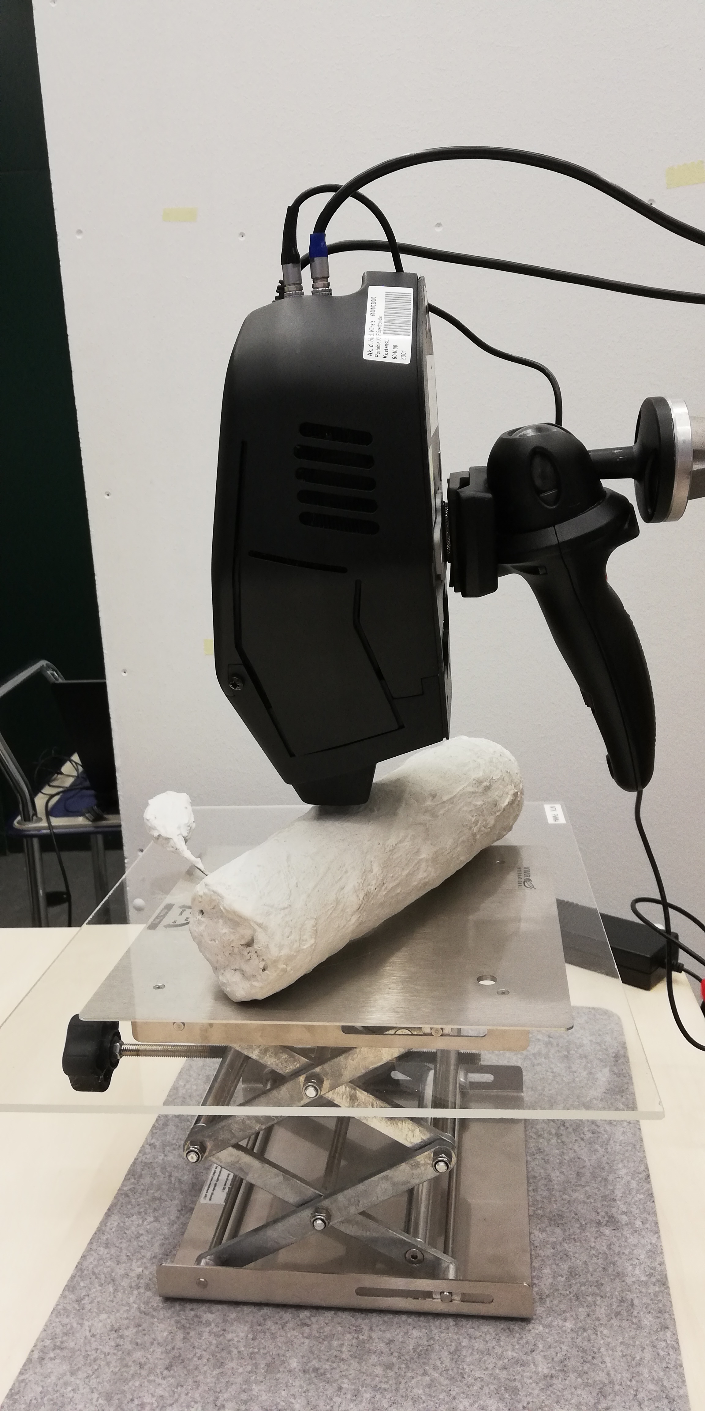 On a height-adjustable table lies a transparent plate on which a white, elongated object is placed, above which is a device for X-ray fluorescence analysis, which is place