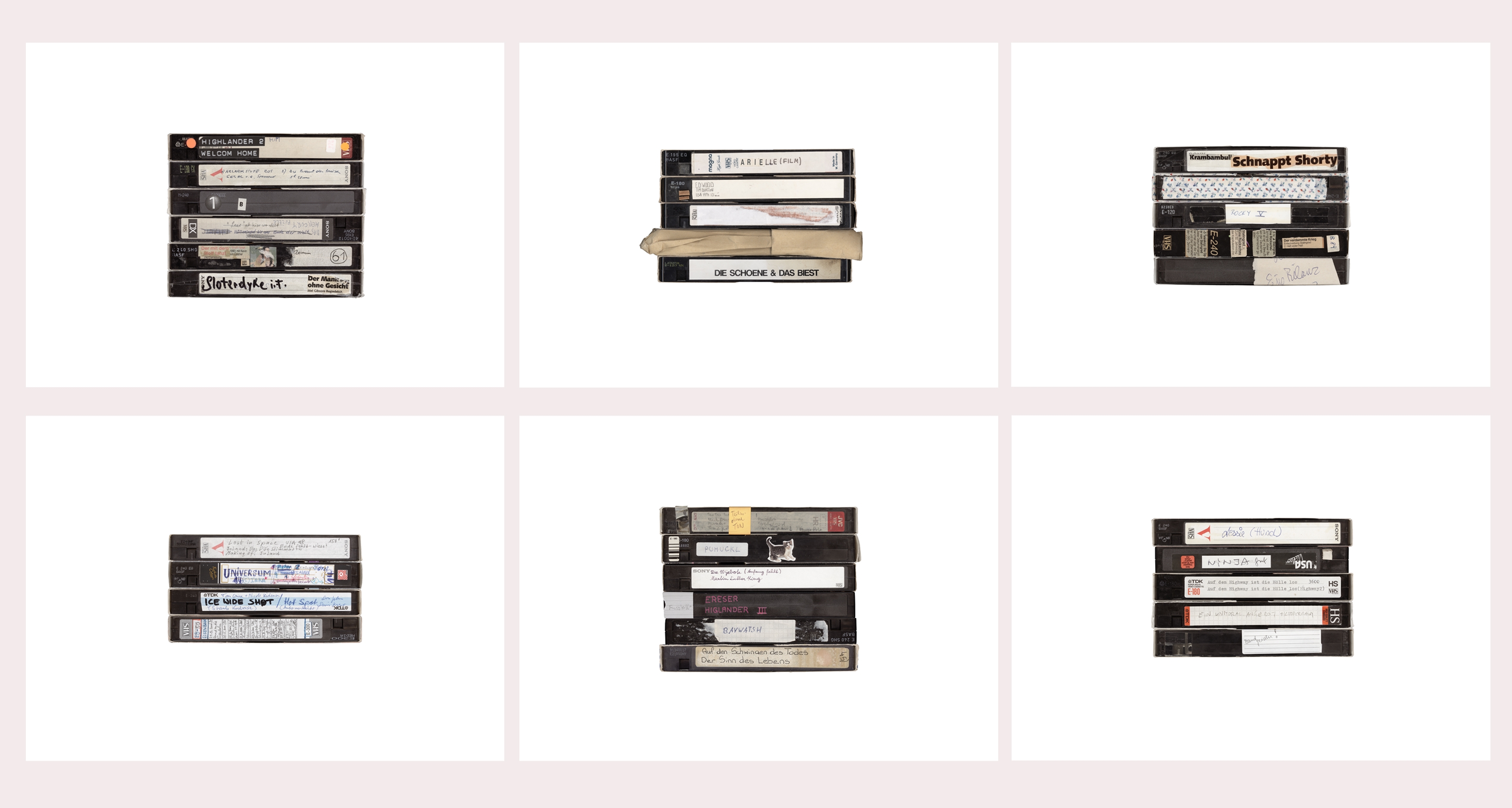 The work consists of six large-format photographs and a publication in which the artist shows the entire archive of the odd cassettes. The video cassettes were scanned on a flat-bed scanner, and finally reworked and printed in their original sizes.