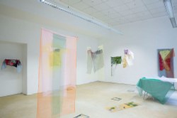 "Maske, eine Aufführung", 2013, installation of cloth objects, various textiles / tulle / lacquer / sequins / photos / newspaper cuttings, photo: th.fr.