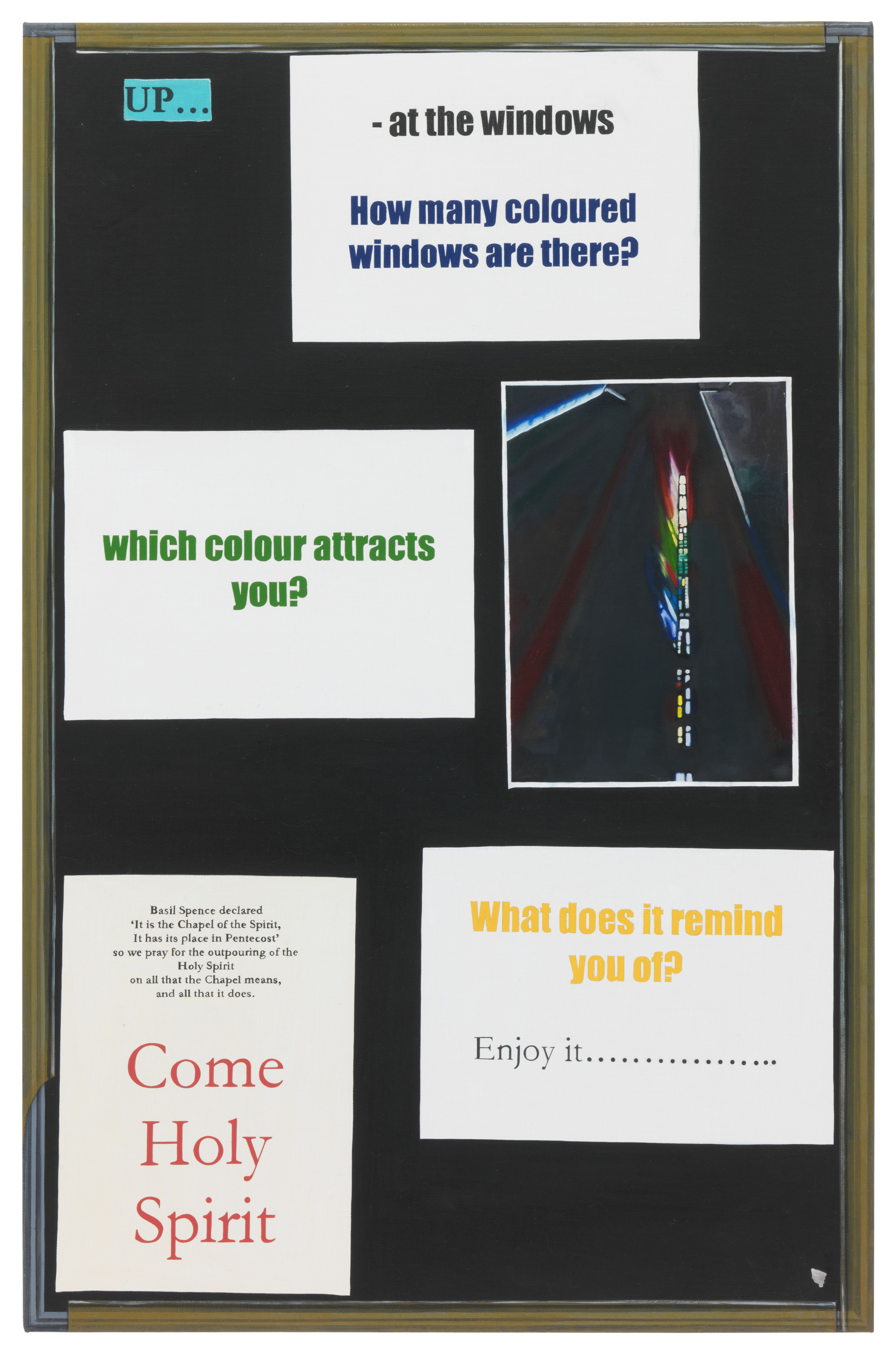 Lucy McKenzie, Quodlibet LVIII (Cathedral Pinboard), 2015, Courtesy of the artist and Galerie Buchholz, Berlin/Cologne/New York a collage of post its and pictures on a dark ground, with different questions in different colors on white paper LMK_M_2015_10.001.O.jpg image/jpeg Type image/jpeg Dimension Dimension 4372x6607 Size File size 2.1 MB Download View full-size image