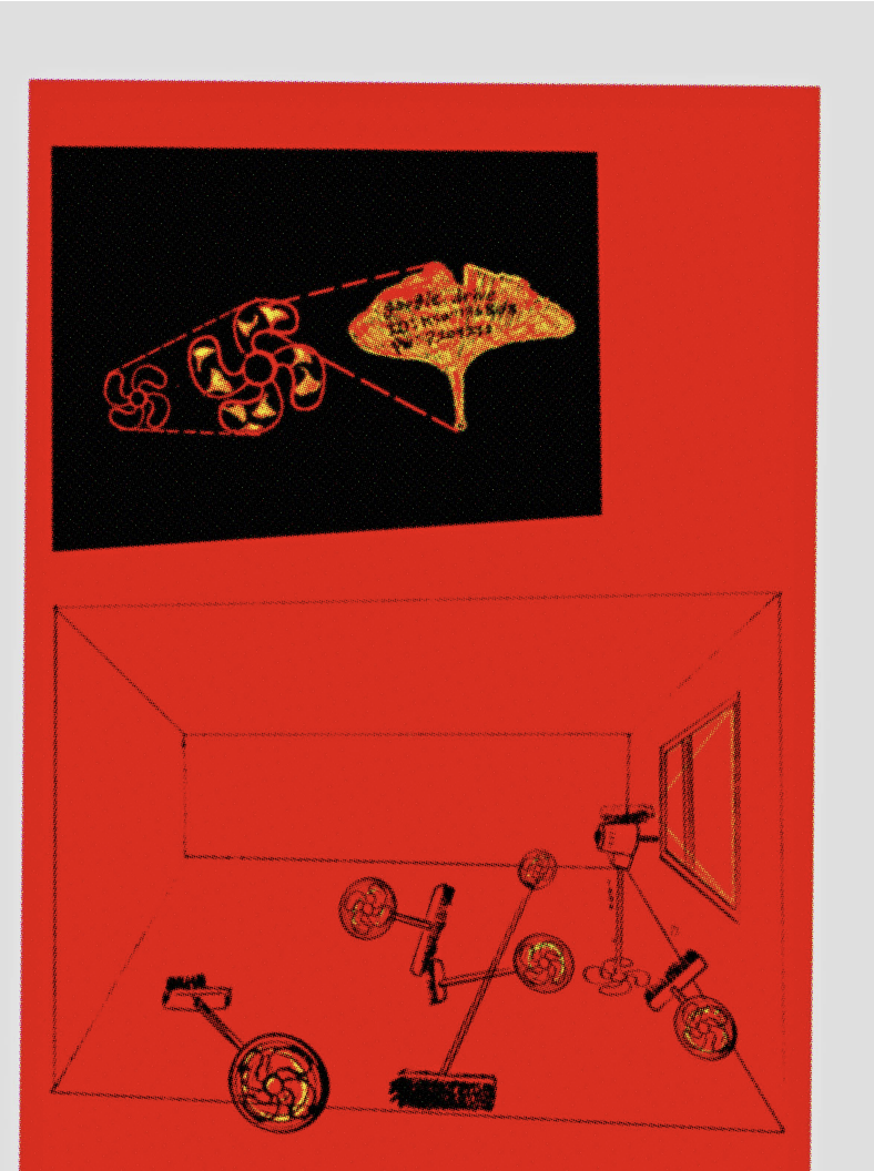 A kinetic installation composed of a bladeless fan, six broom-hybrid fans, and a moving projection, visualizing the suffocation of machinery by digital debris.