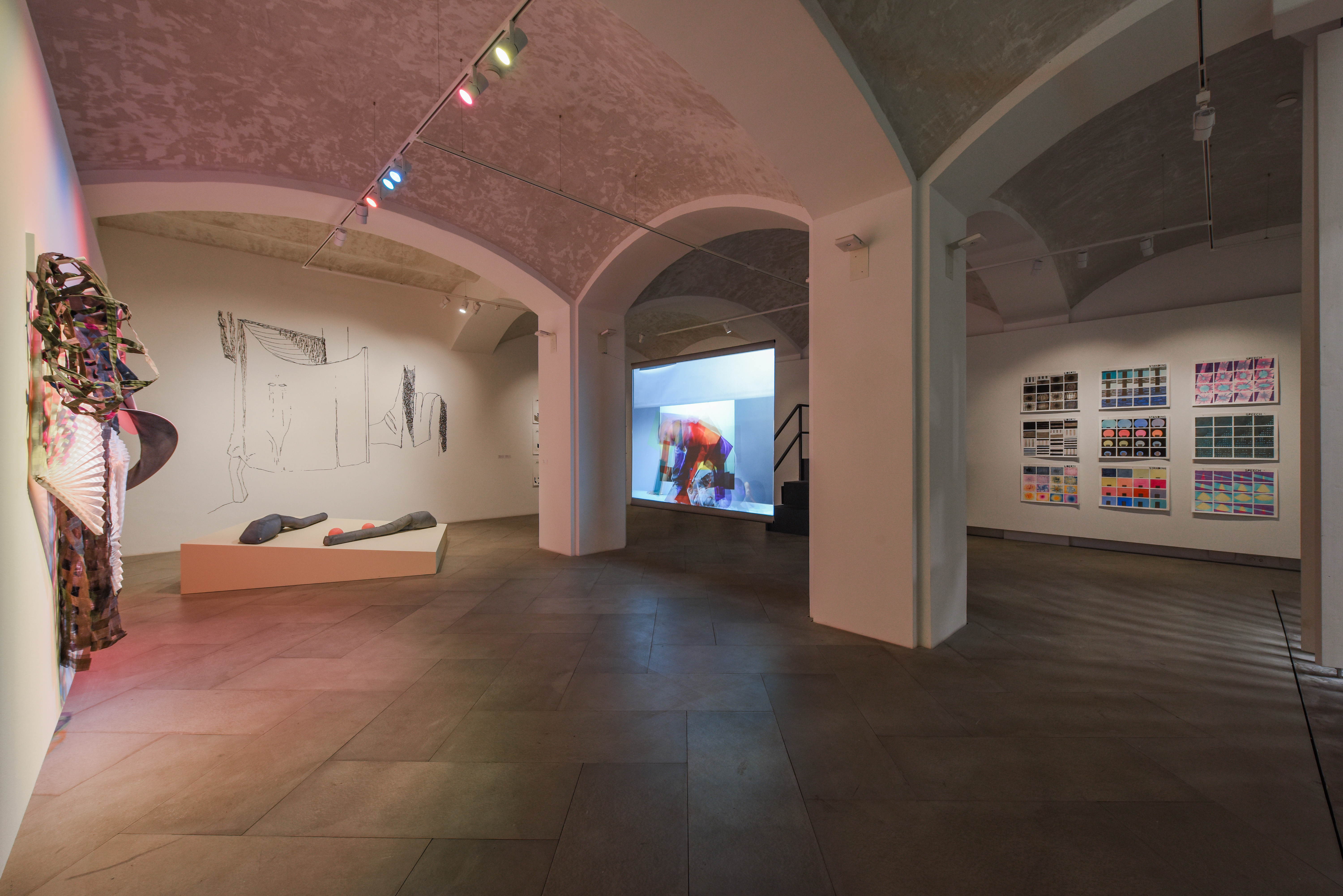 In the basement with vaulted ceiling you can see various works. An expansive wall object, a wall drawing, textile objects on a slanted pedestal, a film screen and 6 framed serial paintings.