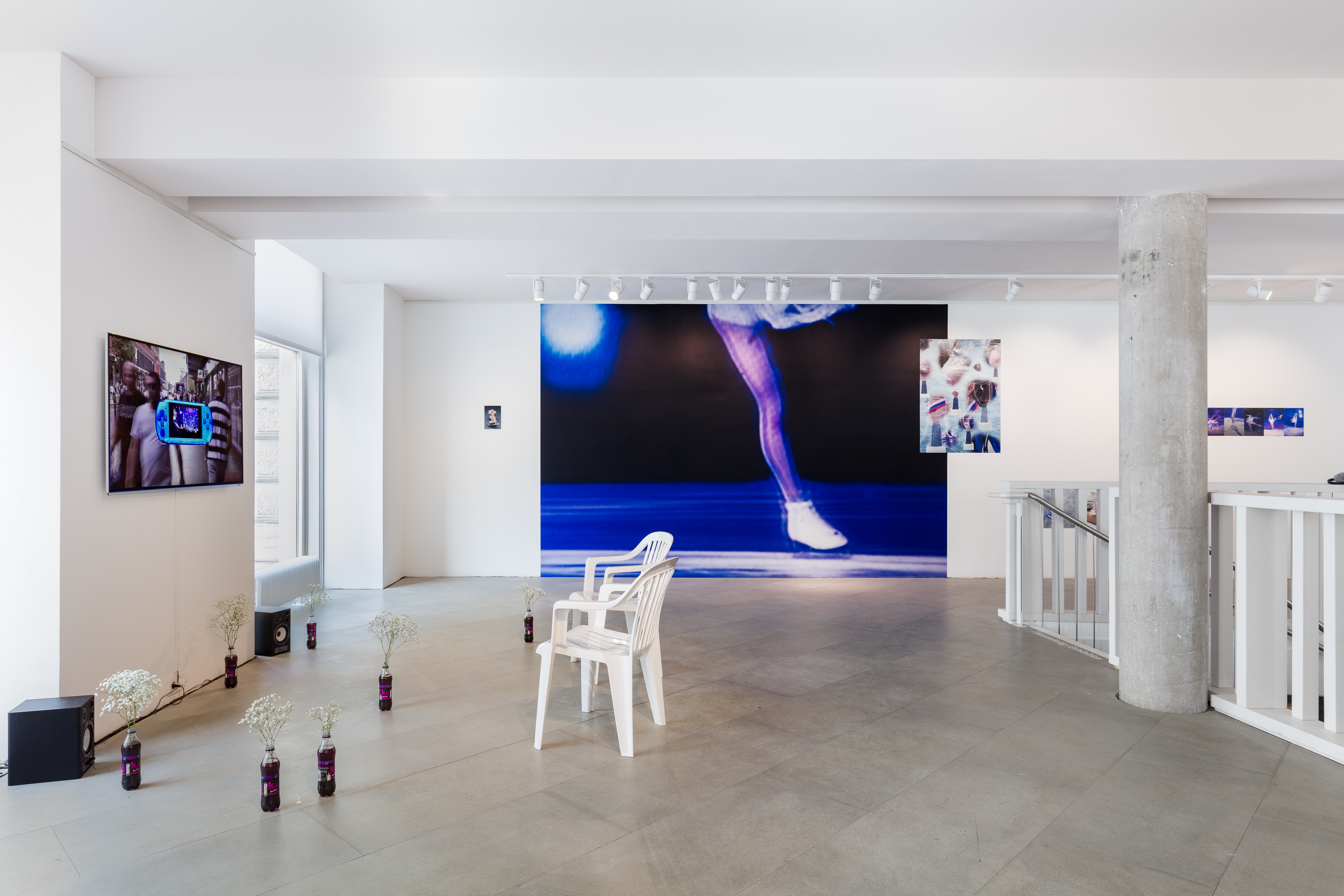 In the exhibition space, Coke bottles with white flowers and two plastic chairs stand in front of a screen. In the background a photo wallpaper with the leg of a skater and other photographic explorations of the theme.