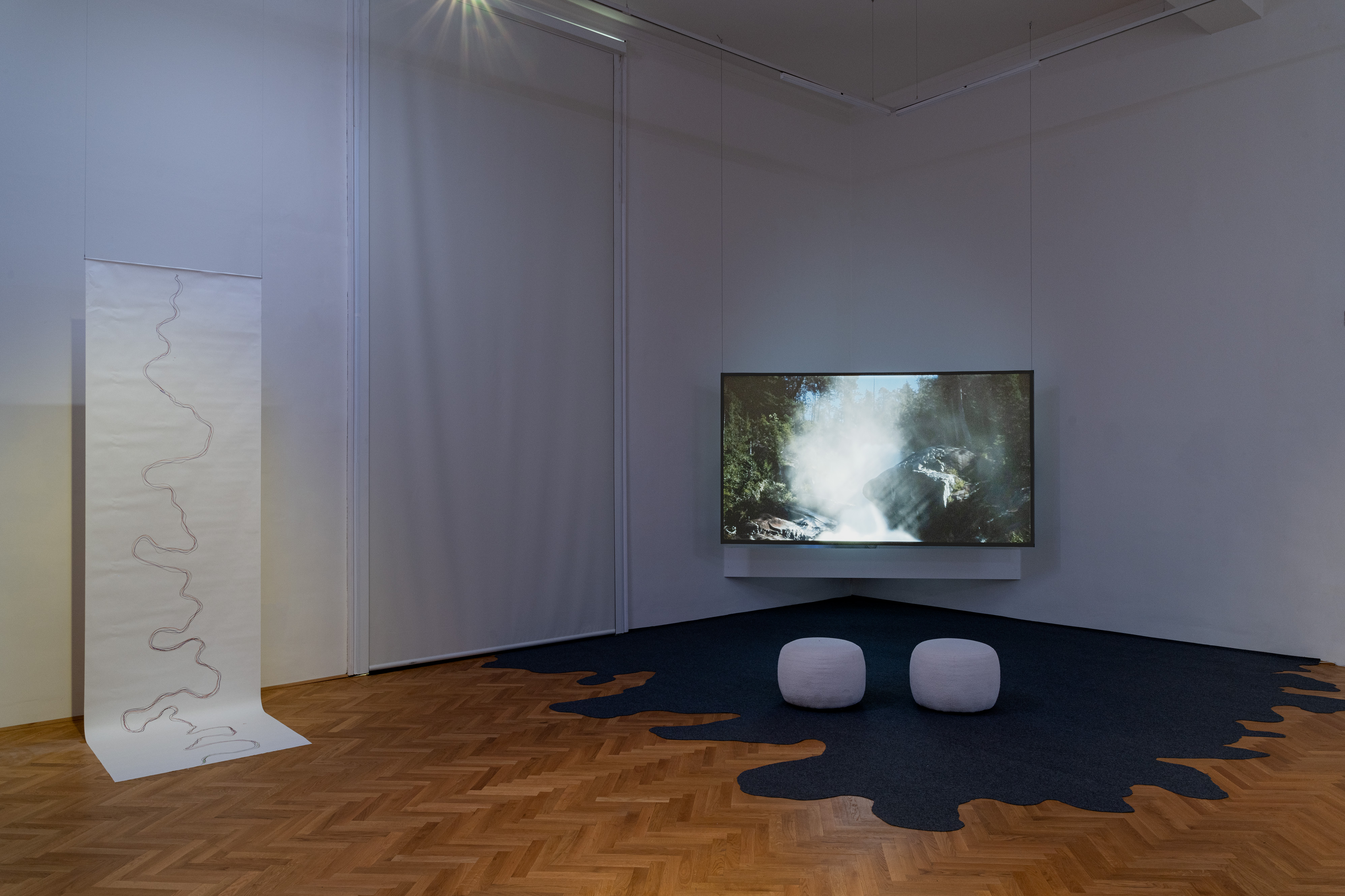 Exhibition view, The Taste of Water, © Academy of Fine Arts Vienna, 2022, photo: Simon Veres Ein Screen mit einem Wasserfall, davor 2 Hocker, links sieht man eine Papierrolle, die lose an der Wand hängt. AEP_8918.jpg image/jpeg Type image/jpeg Dimension Dimension 3991x2661 Size File size 2.3 MB Download View full-size image