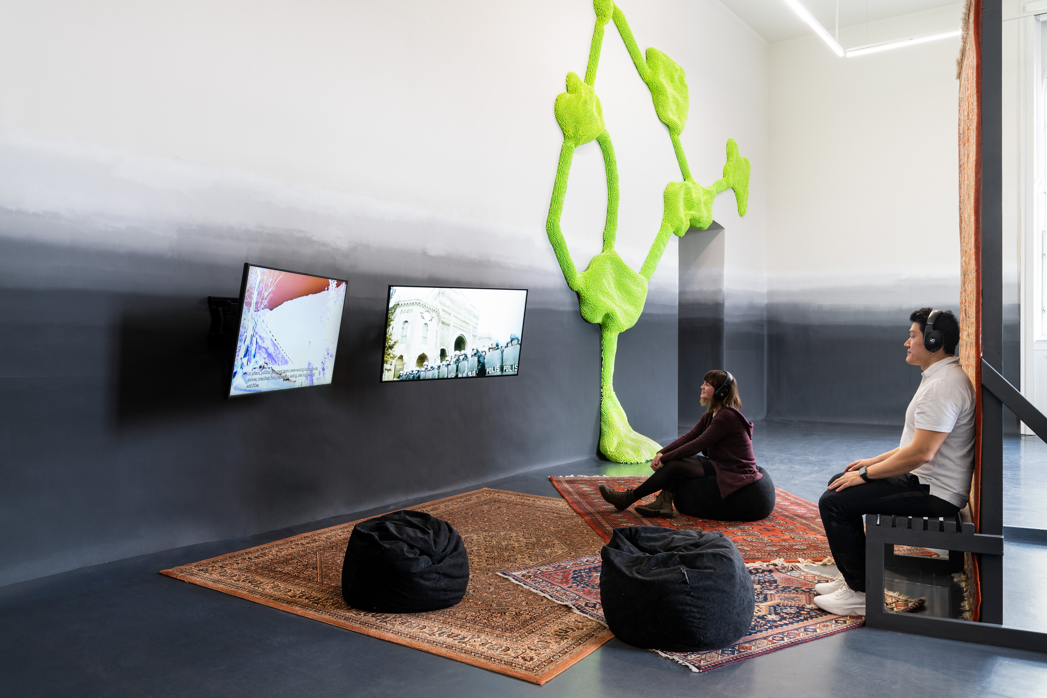 Exhibition view, Sleepy Politics, © Academy of Fine Arts Vienna, 2023, photo: Simon Veres Two people are sitting on carpets in front of 2 screens. In the background you can see a green structure. Ausstellungsansicht _Sleepy Politics_ - Exhibit Galerie, 2023(2).jpg image/jpeg Type image/jpeg Dimension Dimension 4128x2752 Size File size 2.6 MB Download View full-size image