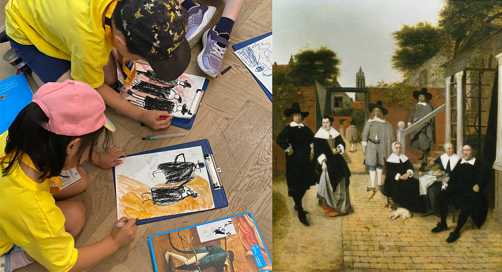 Photo collage using Pieter de Hooch, Family Group in a Courtyard in Delft, c. 1658 © Paintings Gallery of the Academy of Fine Arts Vienna kids draw after an old oil painting KW2August.jpg image/jpeg Type image/jpeg Dimension Dimension 1748x946 Size File size 680.8 KB Download View full-size image