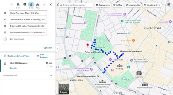 The route will take us to Maria-Theresien-Platz, to the Triton and Nymph Fountains in the Volksgarten, the monument to Emperor Franz I, and on to the Parliament.