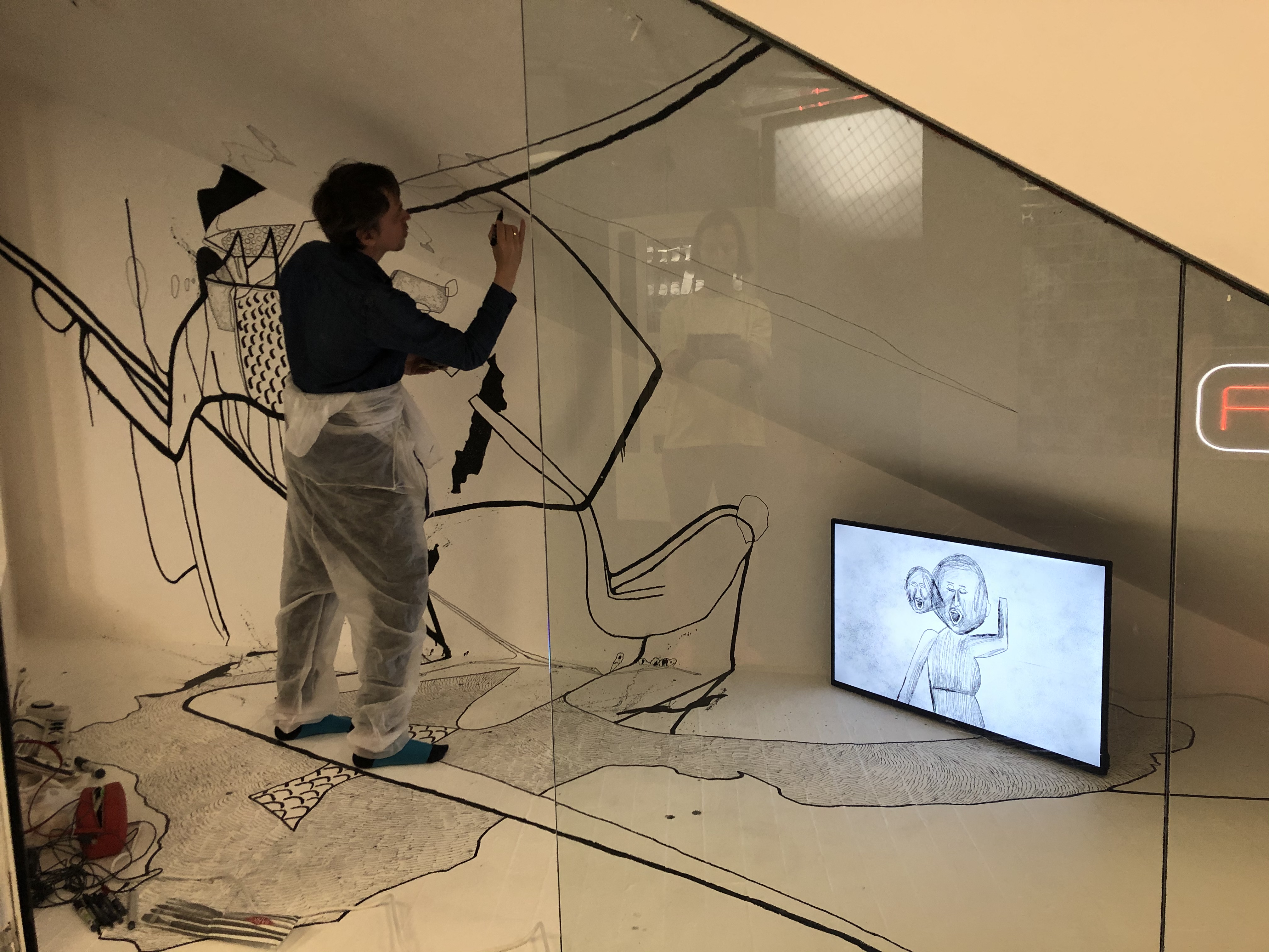 Installation view with artist who is painting the wall with black pen, in the right corner there is a screen with drawn figure