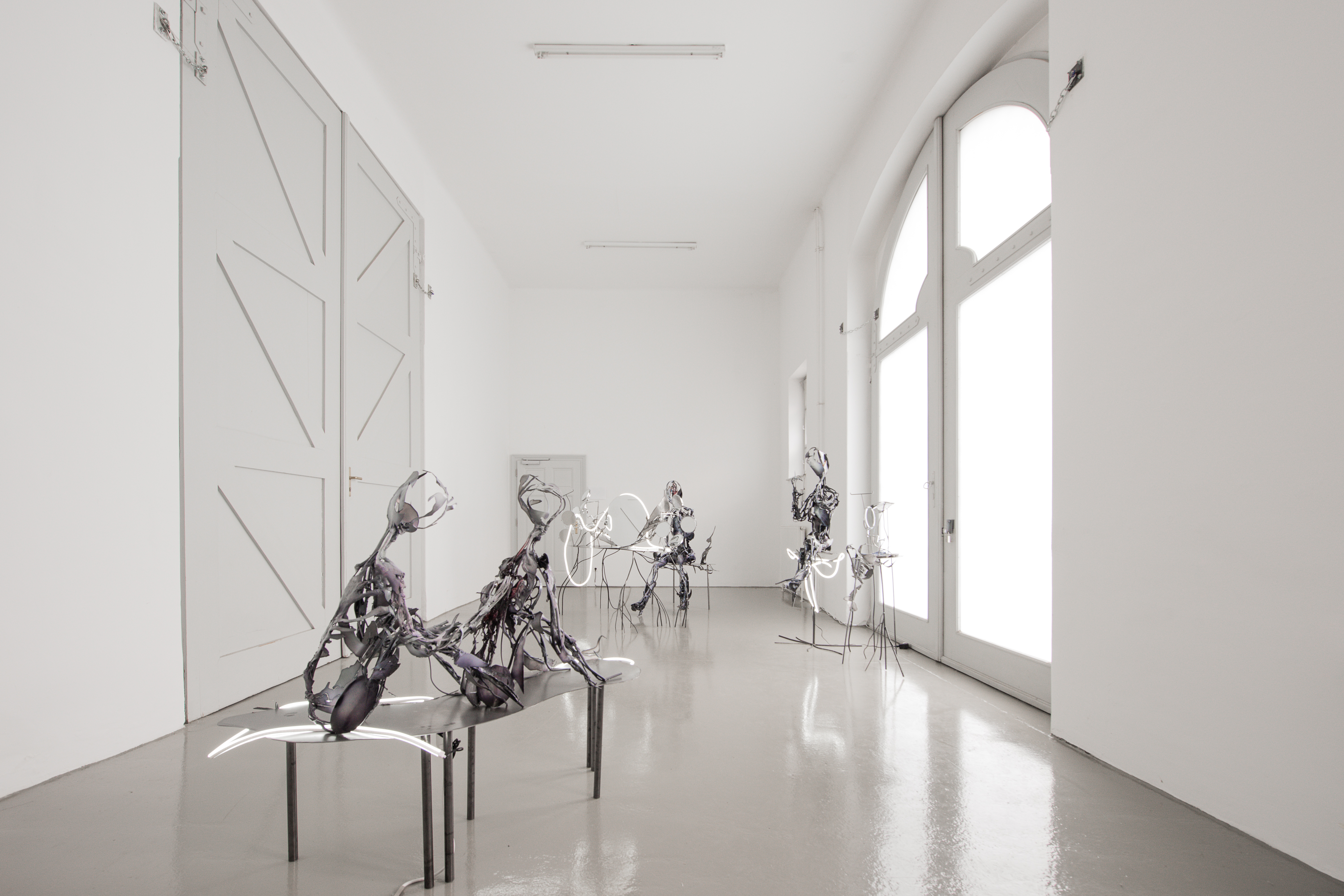 metallische figurenartige Elemente mit Leuftstoffröhren sind sitzend und stehend im Raum verteilt, der Raum wird rechts von einem großen Bogenfenster beäuchtet, links ist eine größe graue Tür