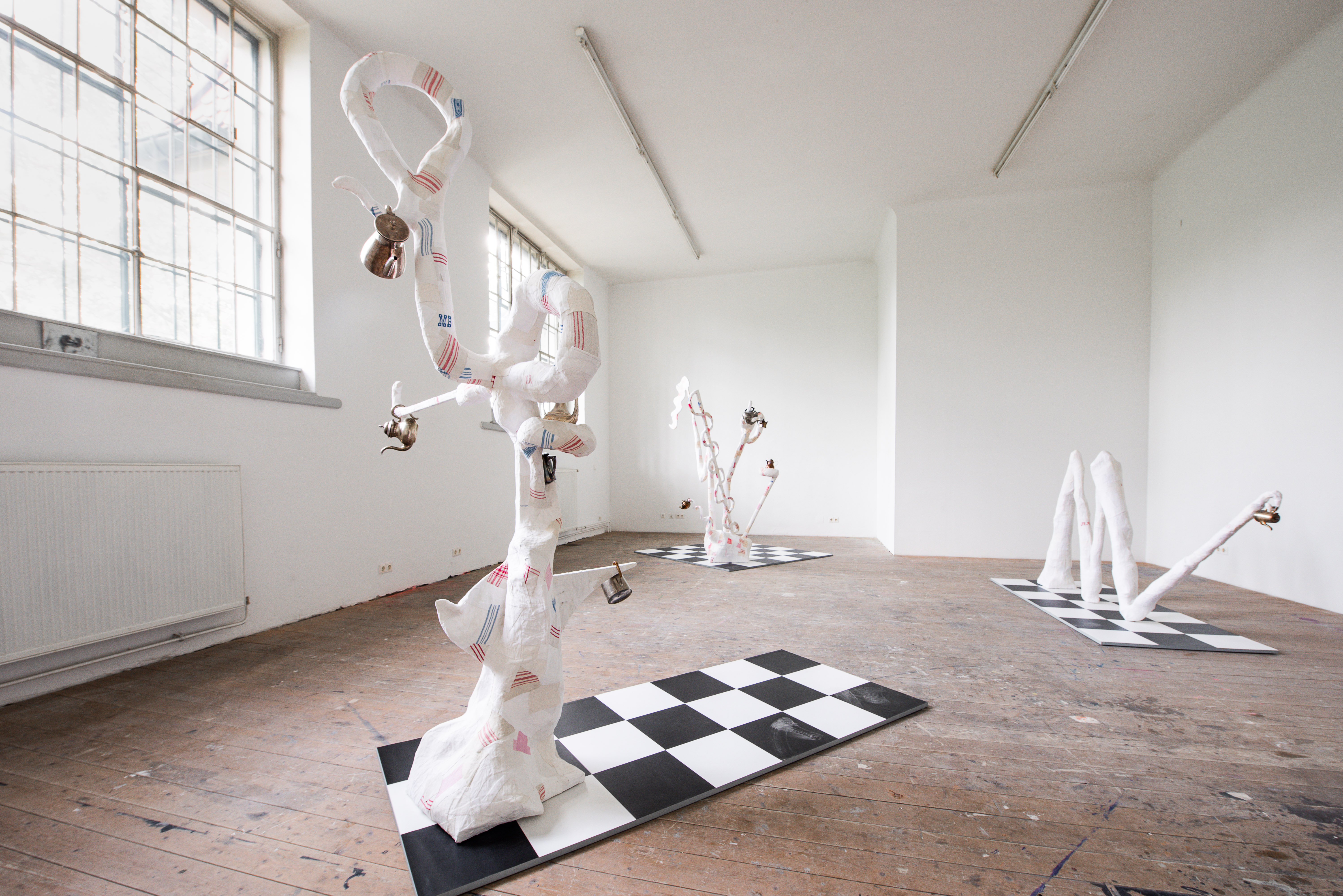 Abschlussarbeit von Albin Bergström, Bildhauereiateliers, Kurzbauergasse, Foto: eSeL - Joanna Pianka 2022 drei rankenartige weiße Gipsfiguren in denen Teekannen hängen, auf schwarz-weiß karierten Flächen eSeL_Joa-0449.jpg image/jpeg Type image/jpeg Dimension Dimension 6000x4004 Size File size 4.1 MB Download View full-size image