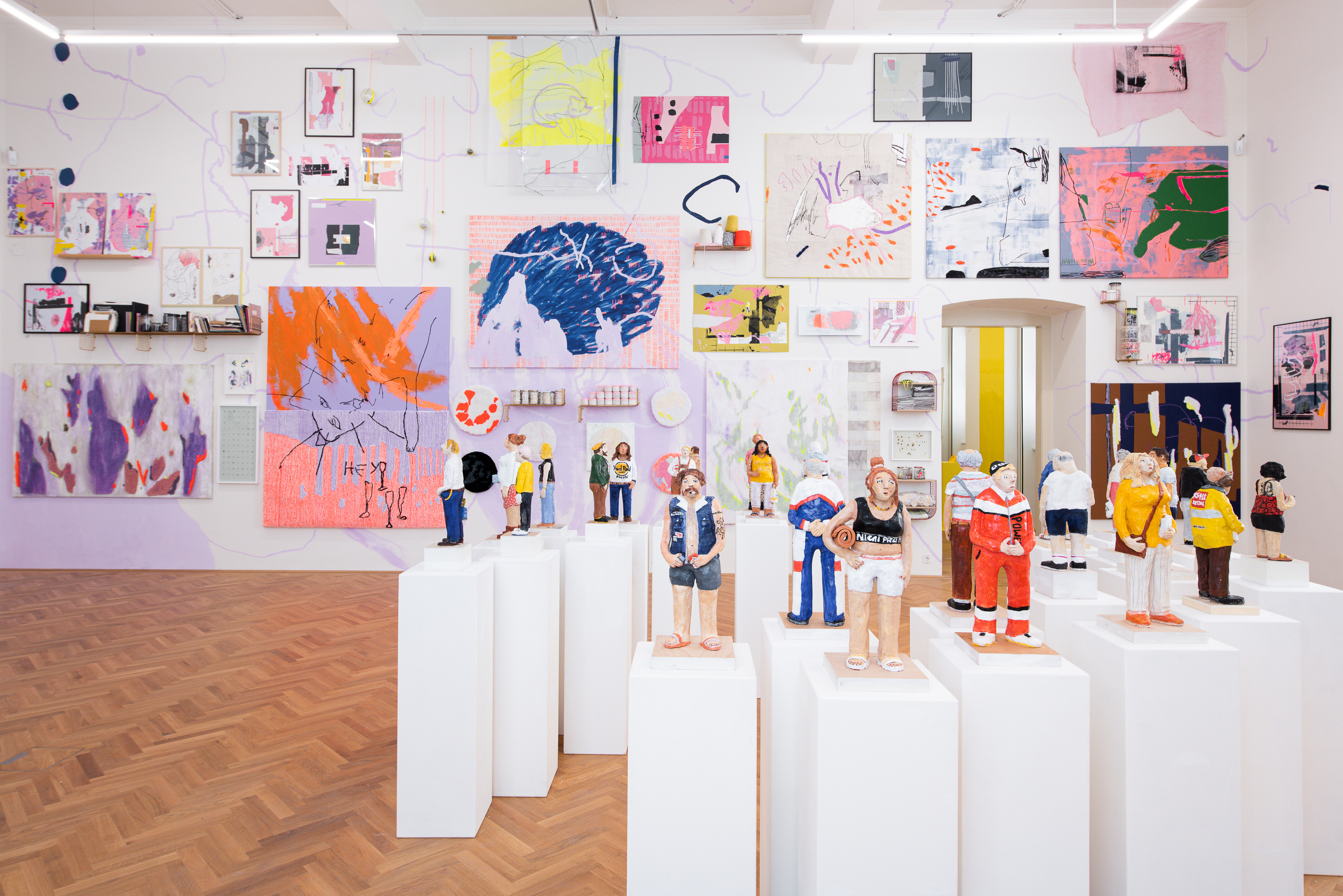 Foto eines Ausstellungsraums mit kleinen bunten Figuren auf weißen Podesten, im Hintergrund bunte Zeichnungen und Malereien an der Wand