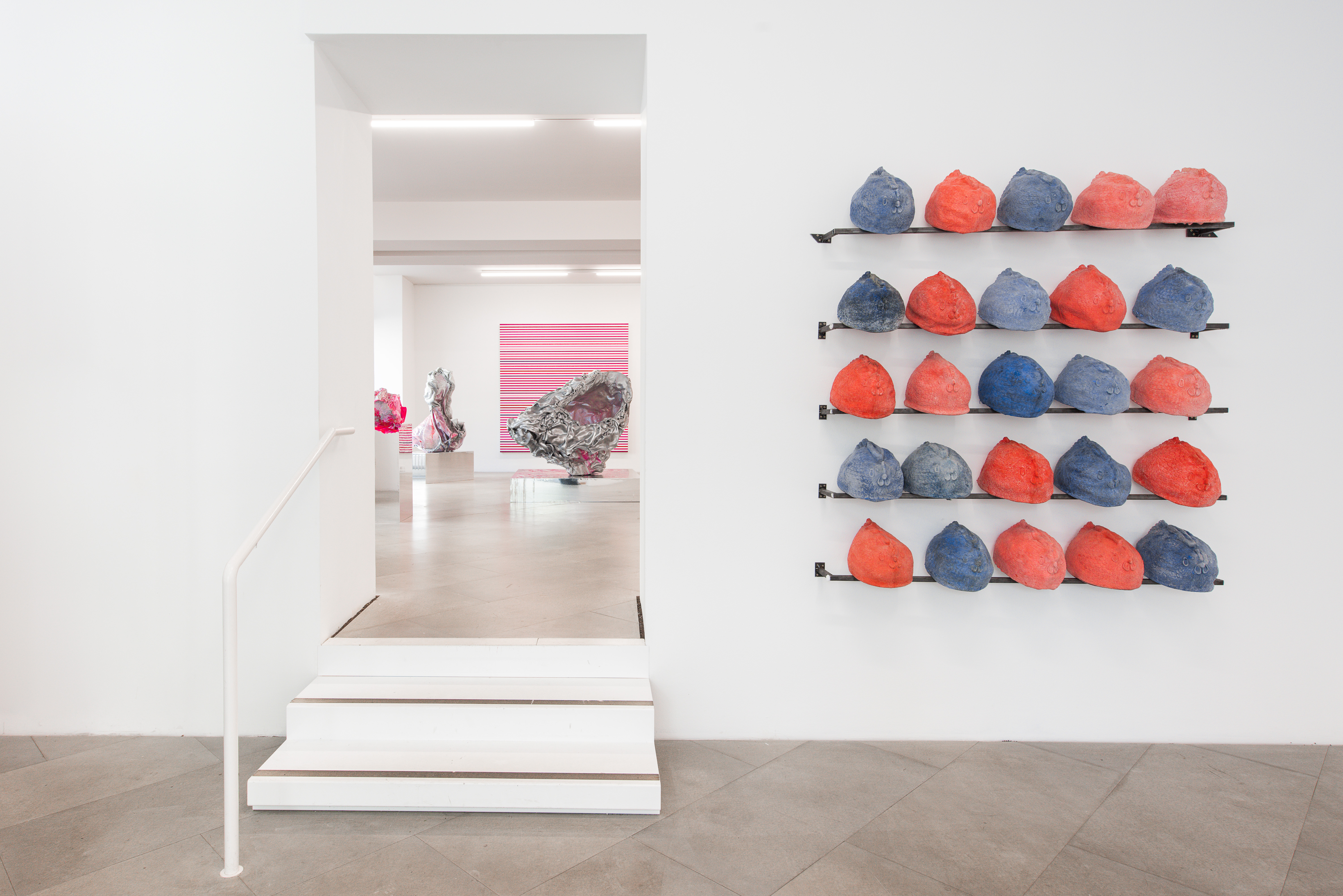 ein Raum mit zwei weißen Stufen und einem weißen Geländer, rechts rote und blaue runde Objekte mit hühner Gesichter auf schwarzen Leisten aufgereiht, links Blick in den nächsten Raum mit silber-rosanen Skulpturen