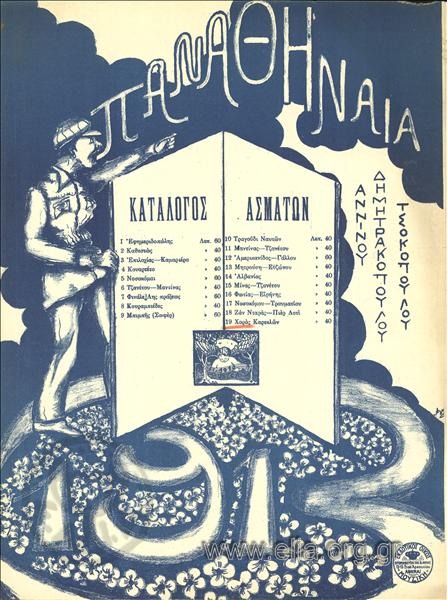 Cover of musical score from Panathinaia (1913), revue by Babis Anninos, Polyvios Dimitrakopoulos and Georgios Tsokopoulos. Score published by Mystakidis-Efstathiadis-Makris, Athens, Stoa Arsakeiou 13-15. © The Hellenic Literary and Historical Archive of the National Bank of Greece Cultural Foundation (ELIA/MIET), digital collections .