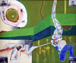 The exhibition at the Academy focuses on Lausen's experimental phase and years of quest from 1963 to 1965. The presented 36 paintings illustrate how the artist's expressionist gesture was curbed by a broken ornamentation modeled on Hundertwasser's works. Uwe Lausen remained fascinated by the human body, its pleasures and pains and turned to Francis Bacon for inspiration. Yet, relying on tricks which would be categorized as dirty along the rules of traditional painting, he avoided balanced compositions. Abstract biomorphic forms clash with realistically painted details. As in illustrations of old street ballads, the canvases are divided into rectangular windows. Unexpected abstract ornaments remind us of cancellation postmarks. Lausen also glued pictures from newspapers onto his paintings. With these techniques that unfold a field of tension between achievement and failure, Lausen developed a repertoire people can still profit from today.