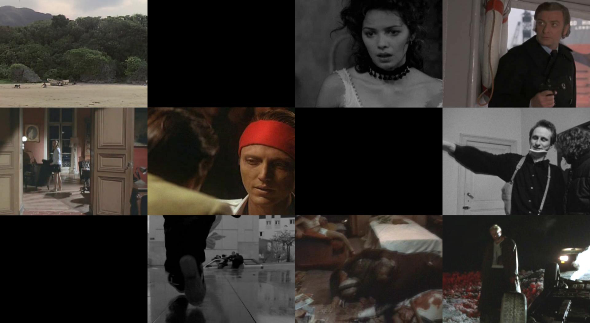 Appearing at different times against a black background, twelve simultaneously running scenes fill the screen, synchronising their climax with the fatal moment of a gunshot.