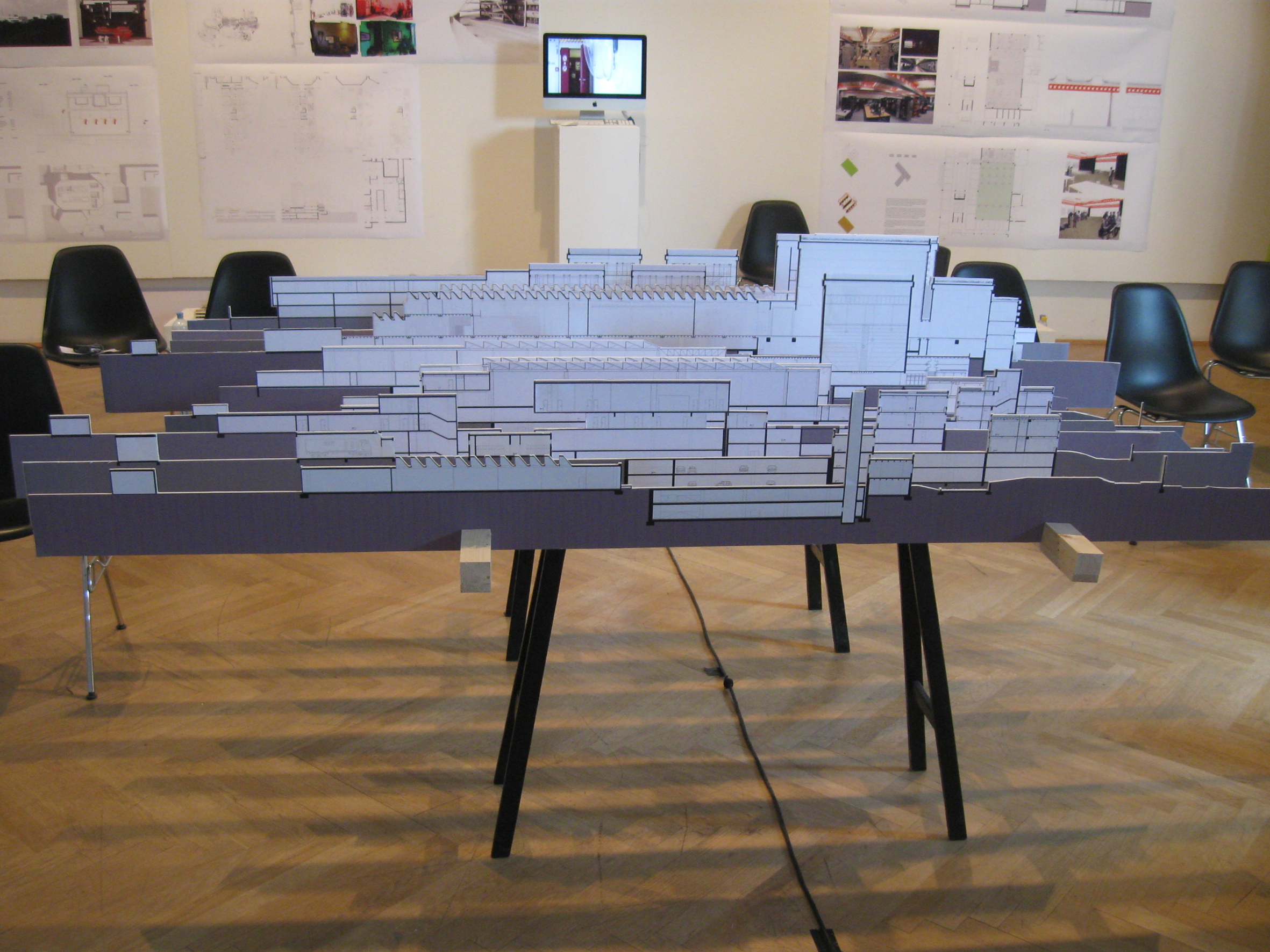 Each theme is displayed as a long landscape-layered table of different heights to present student works. Introductory statements about the respective topics are set at both ends of the displays. Recorded readings of influential and historical texts from the time period, with their pointed criticism of modern architecture, can be heard via headphones. Thus visitors have the opportunity to immerse themselves in both the history and reality of the modern buildings, as well as the history of their critiques.