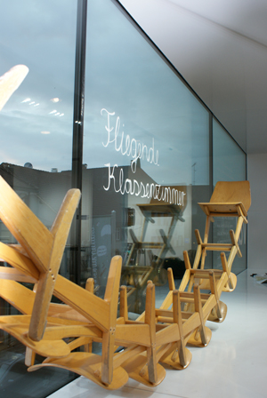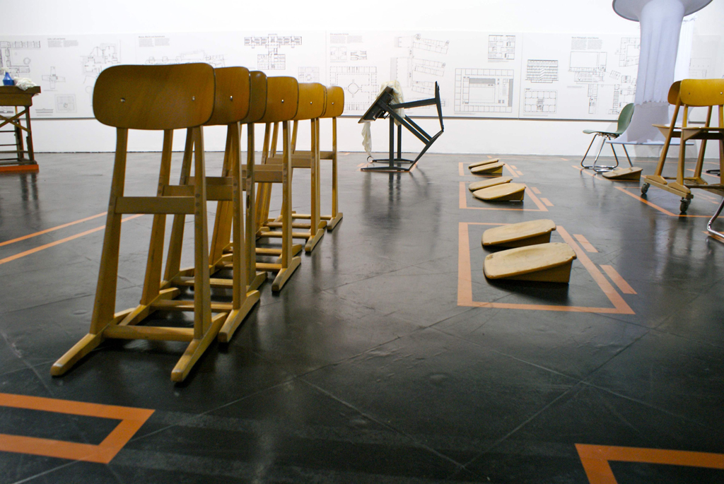 The interactive installations engage the visitor and provide an impetus for communication about visions of future school architecture. A school furniture collage, stretchable fabric rooms ("Raumschläuche"), and a pavilion, used instead of a classroom in one Danish school, can be explored and provoke questions about existing conventions. The history of school architecture over the last 200 years, using plans and models, is documented, including innovative examples from the Az W archive of schools built between 1950 and 1980.