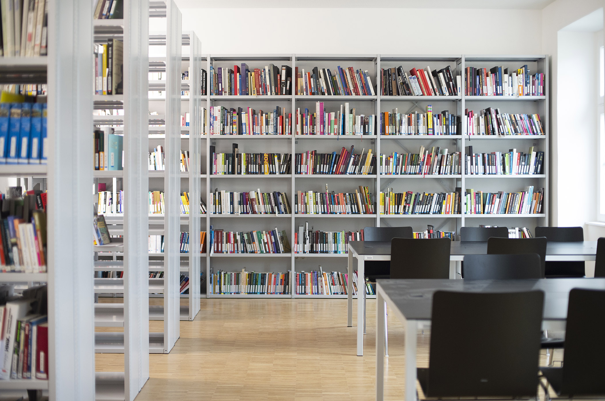 The color photograph shows a light-flooded room with a wooden floor and white walls. On the left and on the front wall are metal shelves filled with books, on the right are the working spaces with tables and chairs made of metal and black wood.