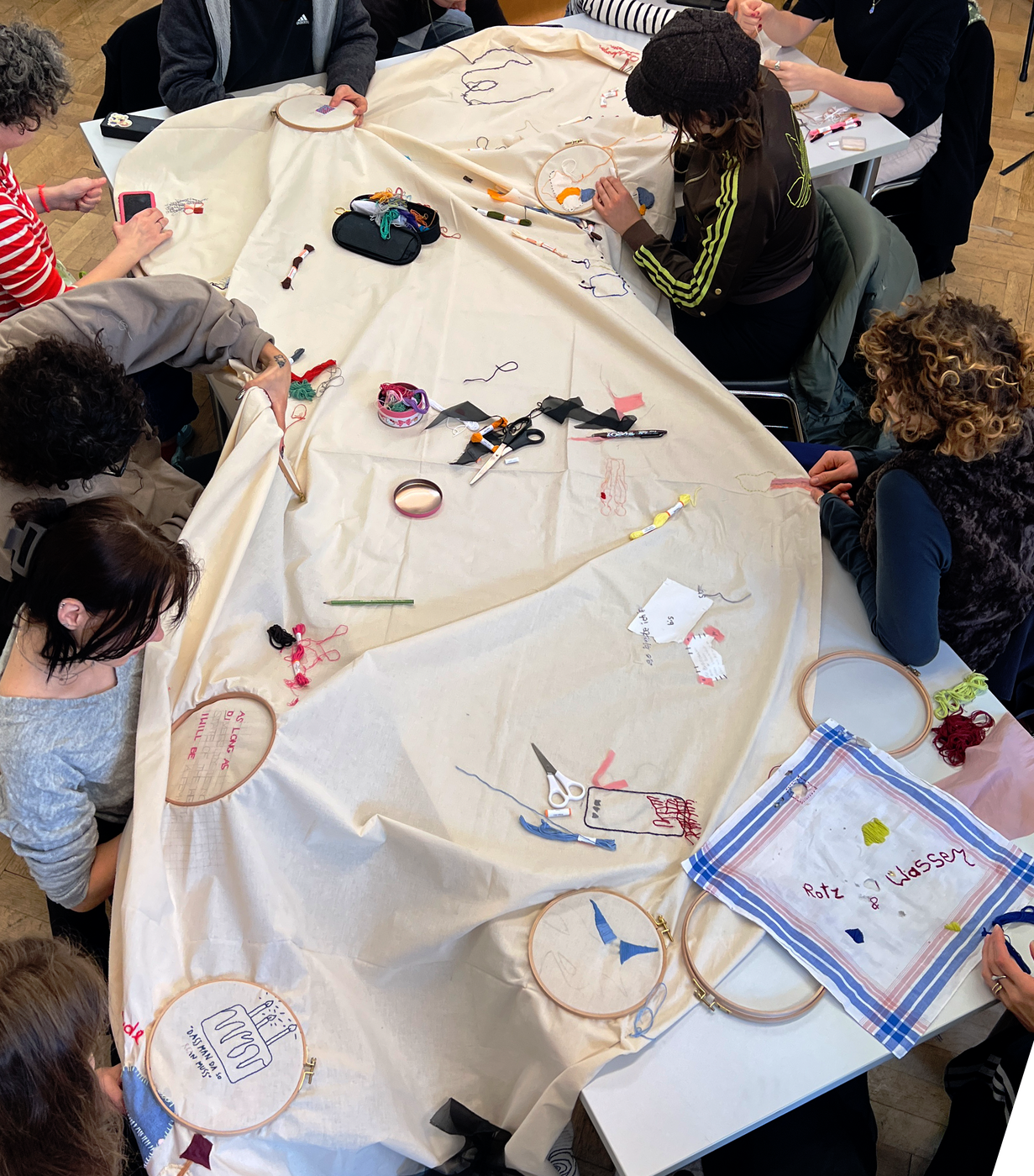 Appropriating, critical decolonial reflection, and transmitting knowledge in relation to the sociocultural and sociopolitical history and present of hand embroidery were just as much a part of the course as learning and teaching the textile art technique. Students explored the needle as a powerful tool used by globally active activist groups and individuals who, artistically, give visibility, tactility, and experientiality to their own narratives. In that way, they claim a place in the male-dominated, white-dominated historical canon and collectively create space for connection, healing, emancipation, and resistance.