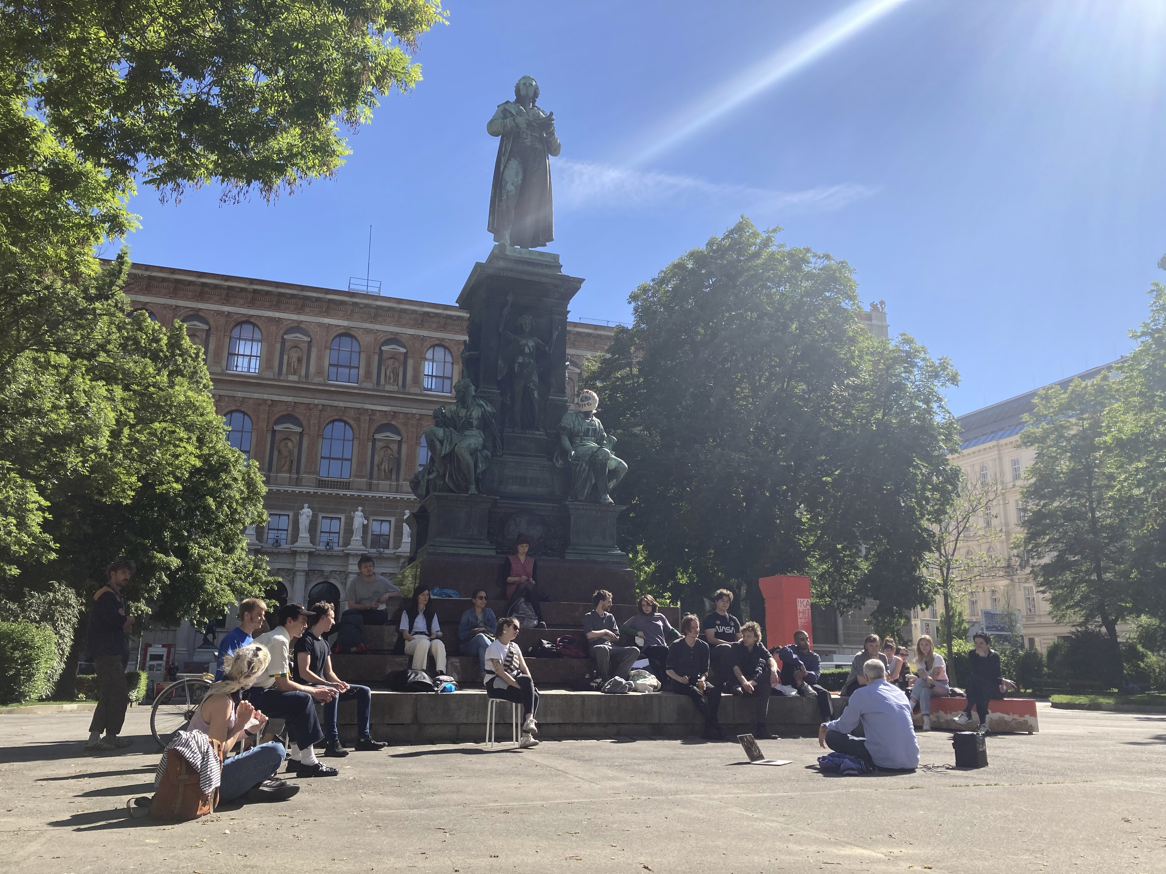 The picture shows a group of students sitting on the pedestal of the Schiller monument, obviously in a teaching situation. It is summer and you can see the baroque monument with Friedrich Schiller, some trees and behind it the Gründerzeit building of the academy.