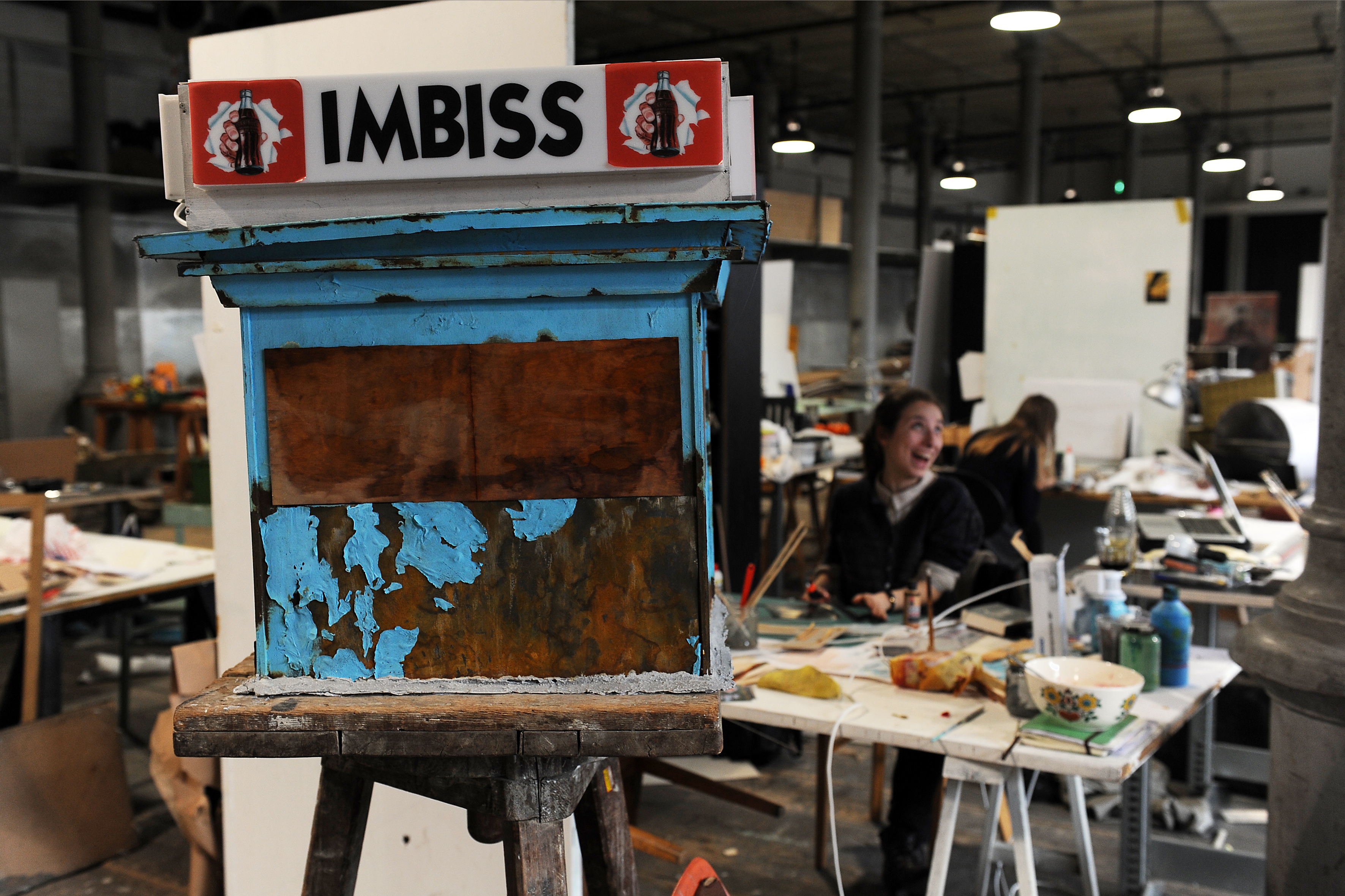 In the foreground you can see the model of a stage setup, a kiosk with peeling blue paint and the inscription "Imbiss" above it. In the background you can see the studio situation with students at tables filled with working material.