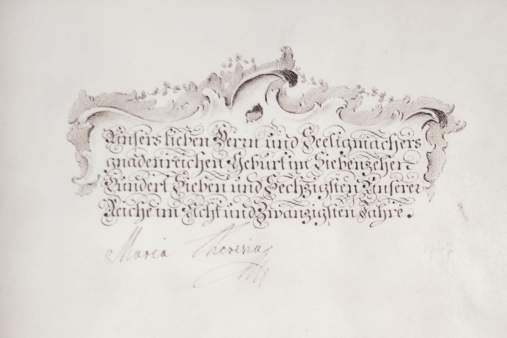Statute of the Engraver Academy, 1767, photo © Eva Schober Detail of the last page of a book with the date of the statute, brown ink on parchment, ornate writing and an ornament above it. Underneath is the signature of Empress Maria Theresa. HP2022_Kupferstecherstatut.jpg image/jpeg Type image/jpeg Dimension Dimension 2105x1405 Size File size 942.7 KB Download View full-size image