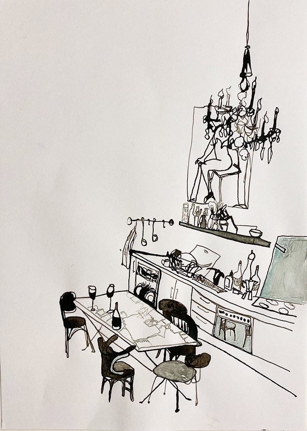 Drawing a room allows to reexperience it and reflect its design. What matters are not the individual objects but the perception of the entire space, which each artist interprets differently.