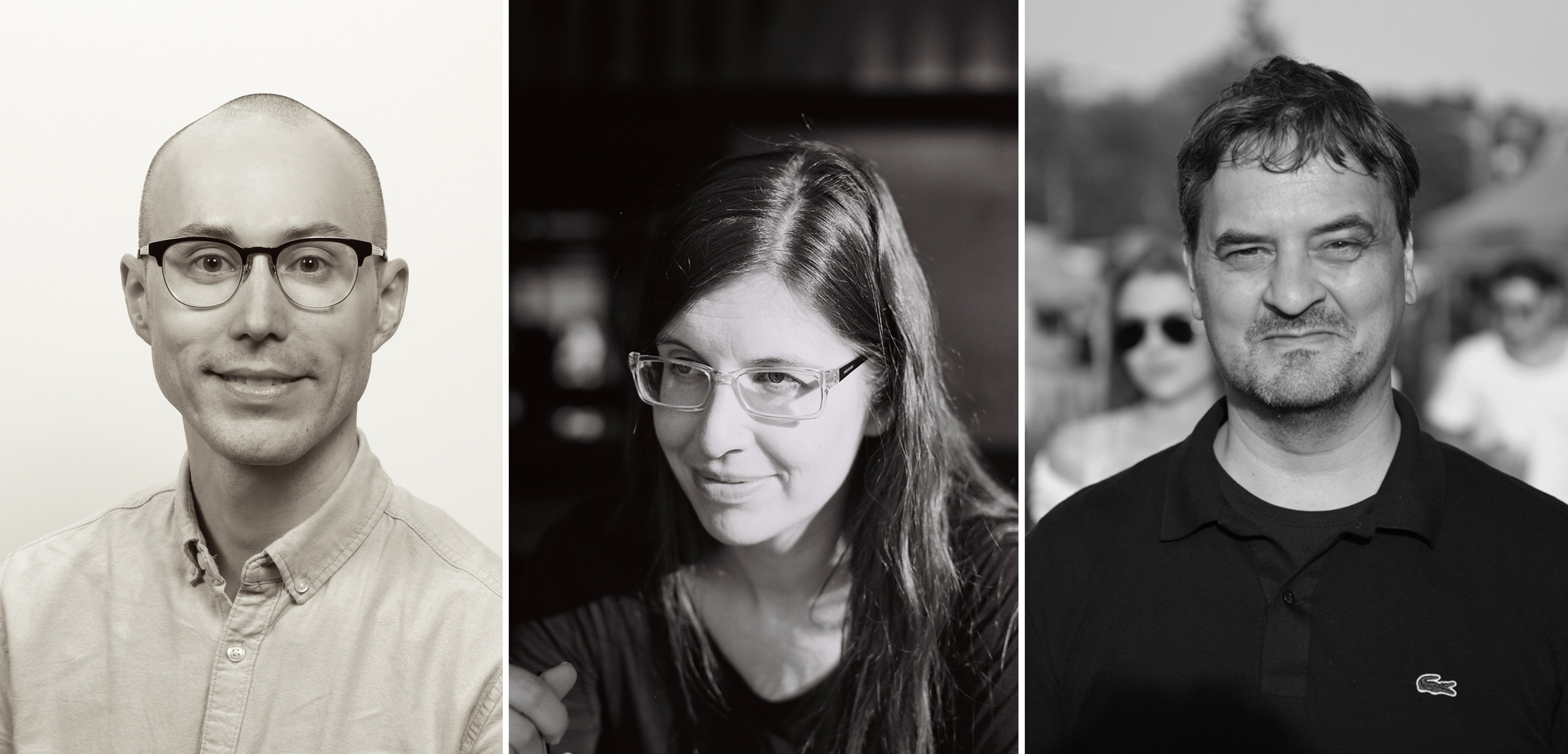 Three black and white photo portraits. Left: Christoph Salcher, a middle-aged man with large glasses and bald head, smiling in a friendly manner. Center: Katharina Tiwald, a middle-aged woman with delicate glasses and long hair parted on the left side, smiling, her head slightly tilted to the left. Right: Peter Waldeck, a friendly looking man in his prime with a full head of dark hair, has his left eyebrow raised slightly.