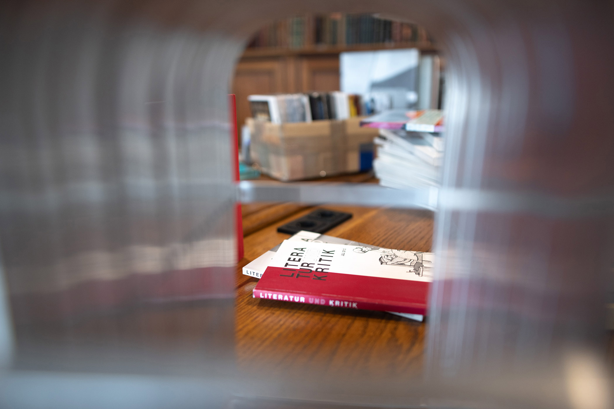 Charity book bazaar of the Academy’s University Library – Impression, January 2024, photo: Felix Kubitza The color photograph shows a blurred wire frame through which a tunnel-like view of a table with books, stacked or in a box, is revealed. 240618_BasarRG24-2697_fk.jpg image/jpeg Type image/jpeg Dimension Dimension 2100x1400 Size File size 278.6 KB Download View full-size image