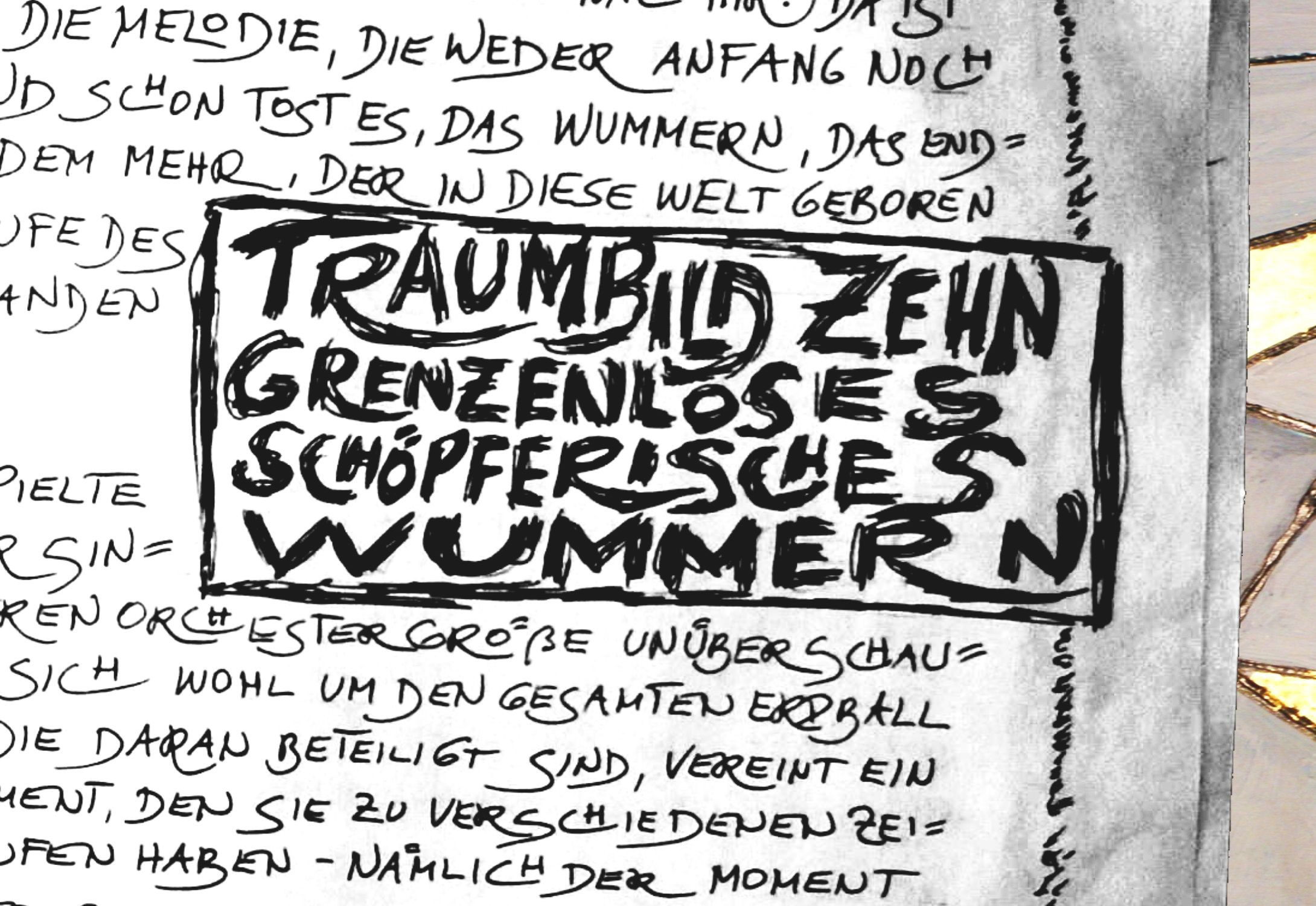 Excerpt of a black and white text passage from the "Codex Kedube" with the words "Dream image ten / Boundless creative hum" in a box.